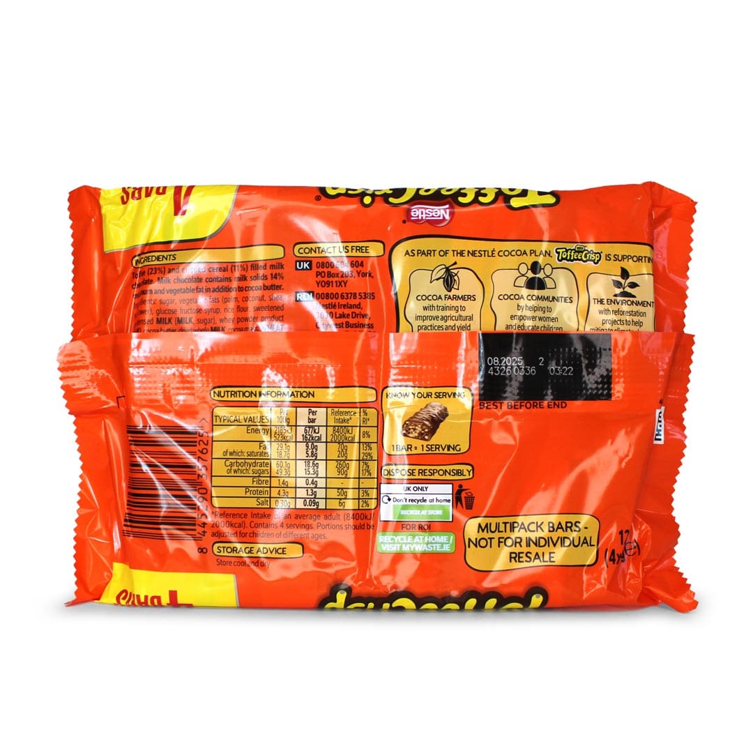 A multipack of four bars of delicious soft caramel & crispy cereal pieces, all encased in smooth milk chocolate. Toffee Crisp, another British classic.